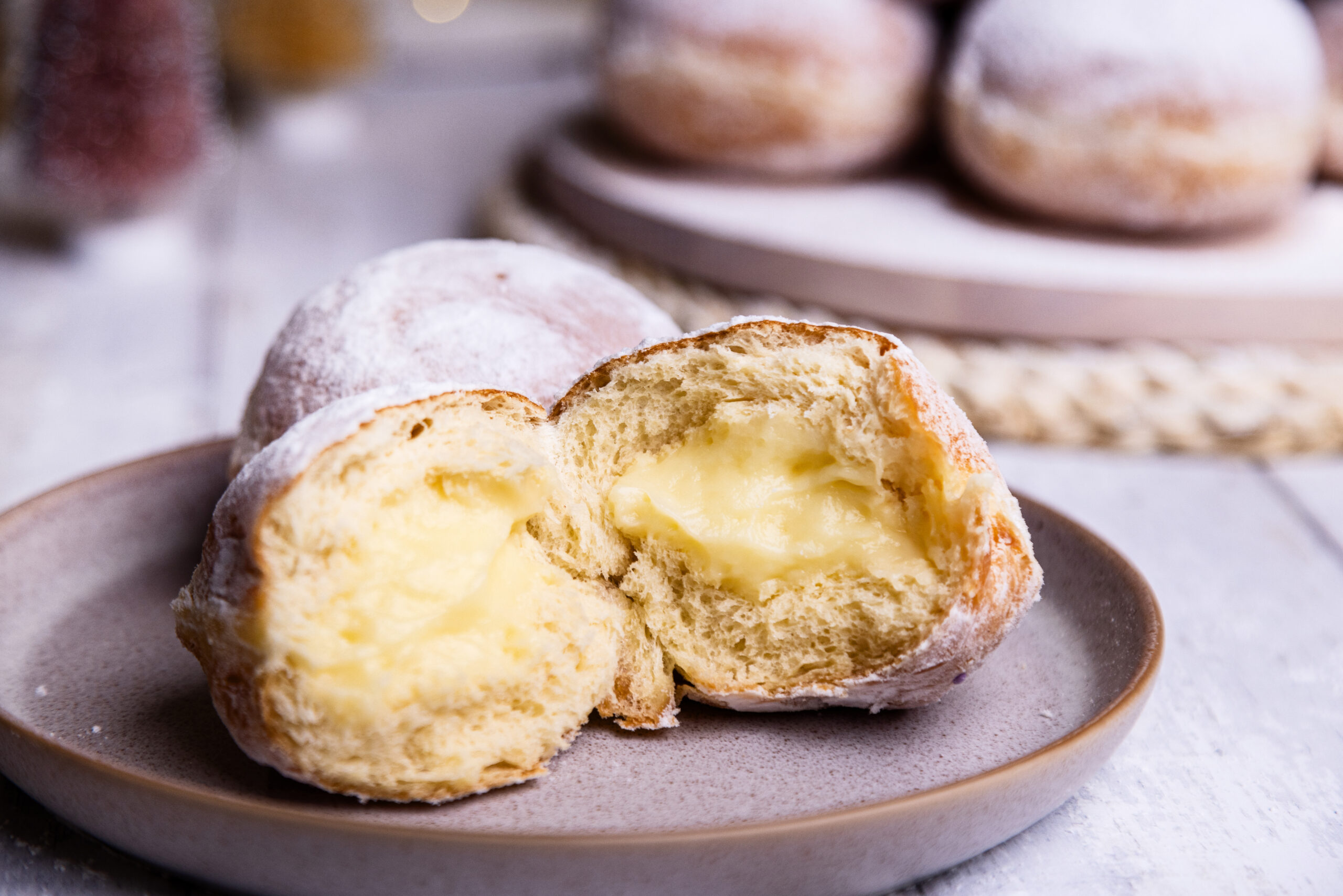 Indulge in a fluffy handmade doughnut filled with creamy custard, coated in sweet snow icing for a delightful winter wonderland treat in every bite.